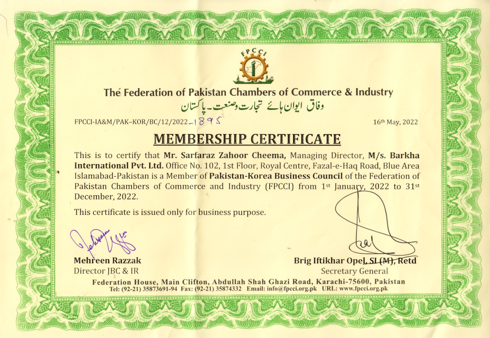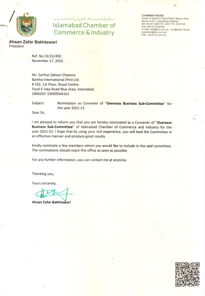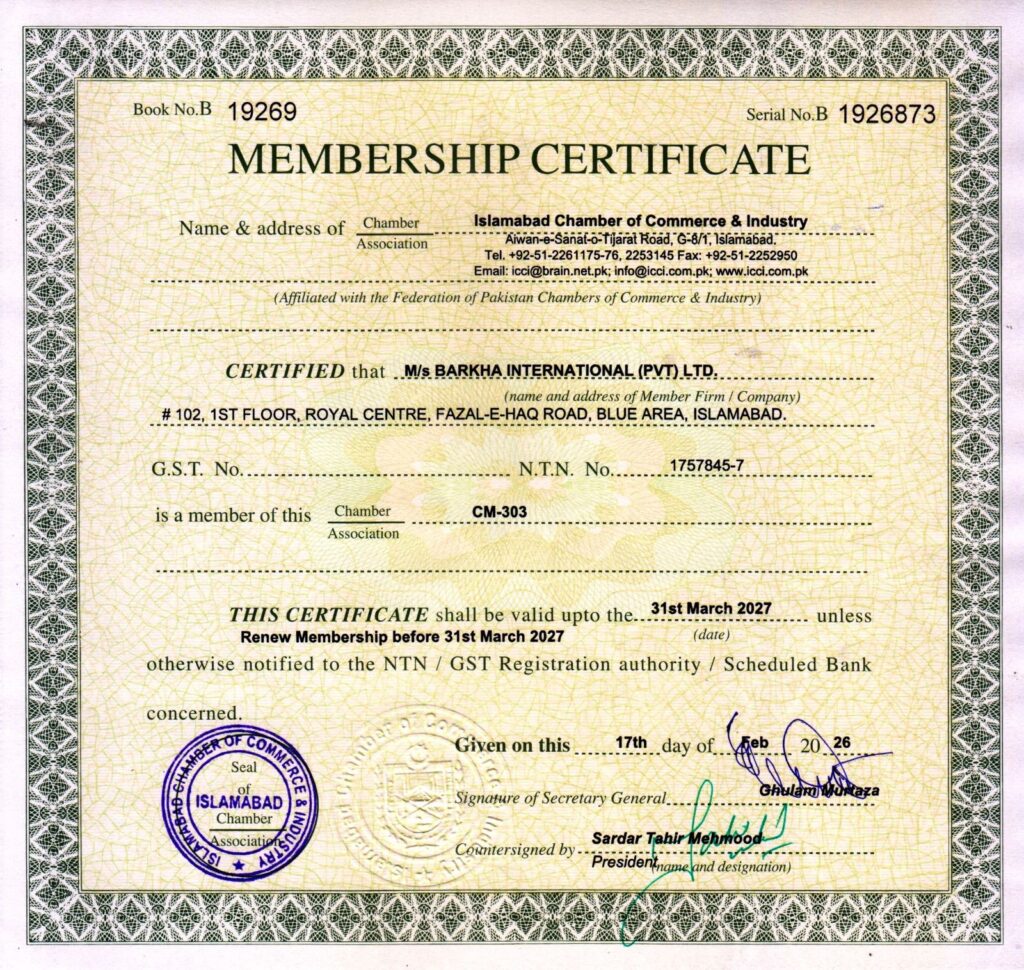 Islamabad Chambers of Commerce & Industry Membership certificate