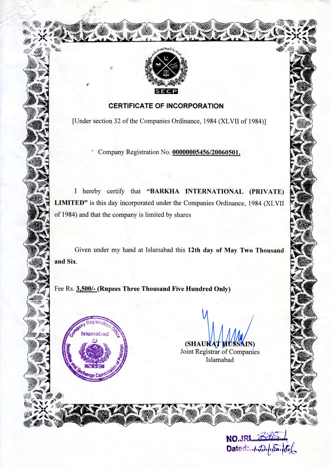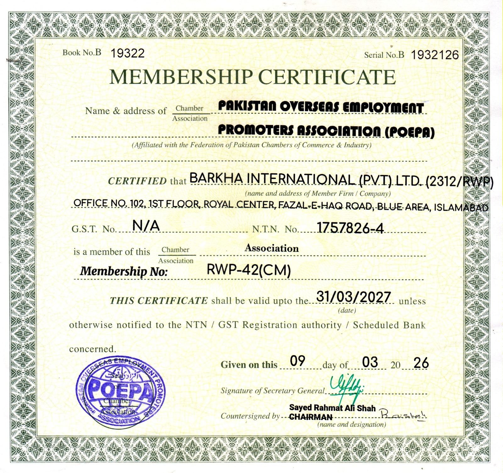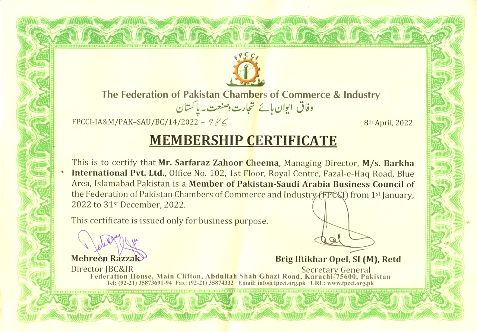 Islamabad Chambers of Commerce & Industry Membership certificate