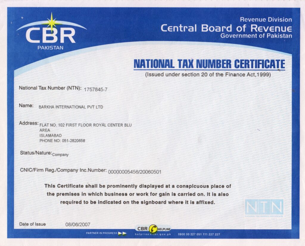 National Tax Number Certificate (CBR)